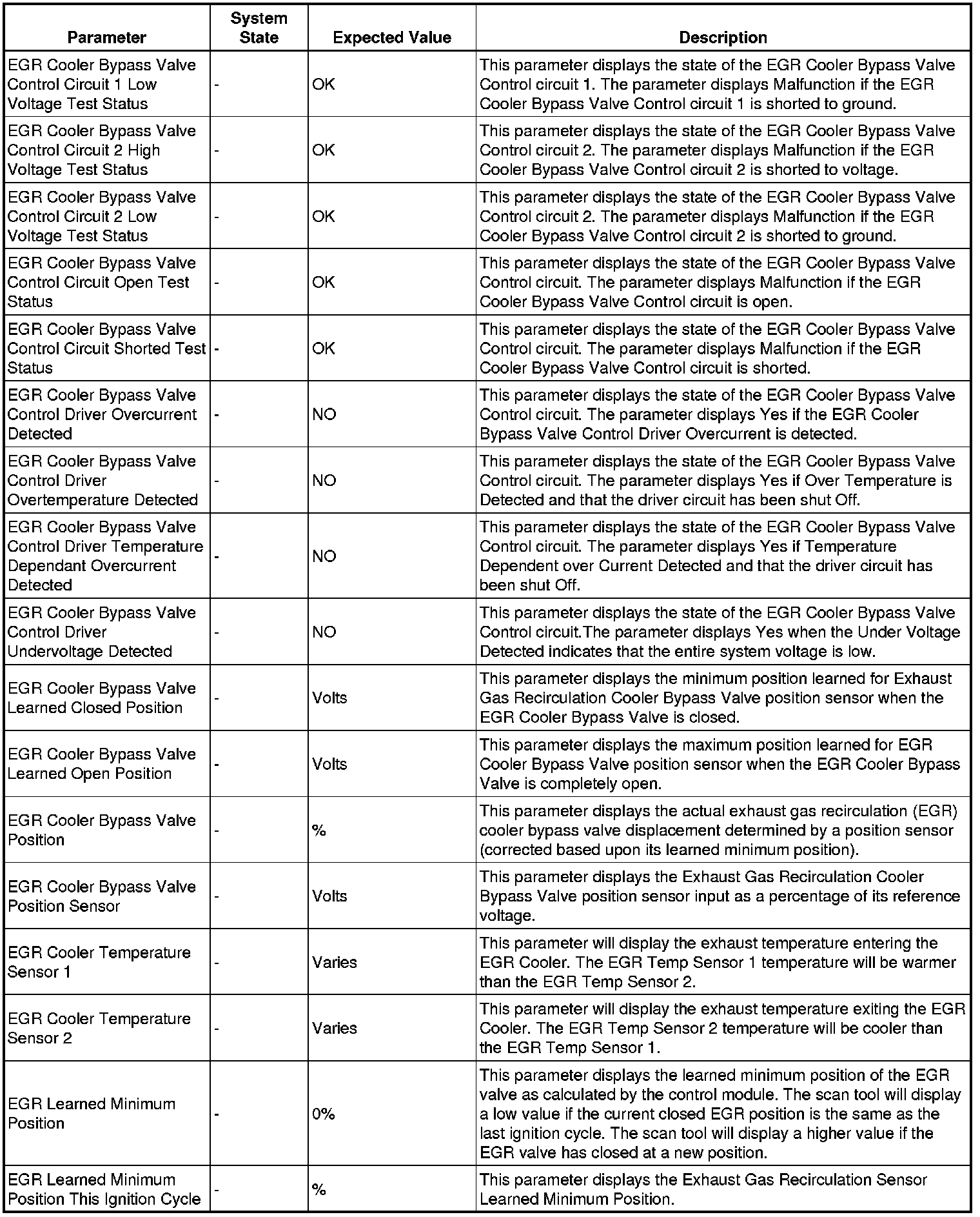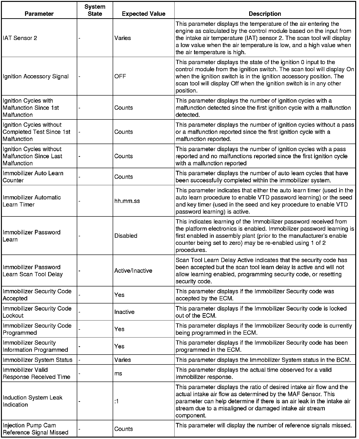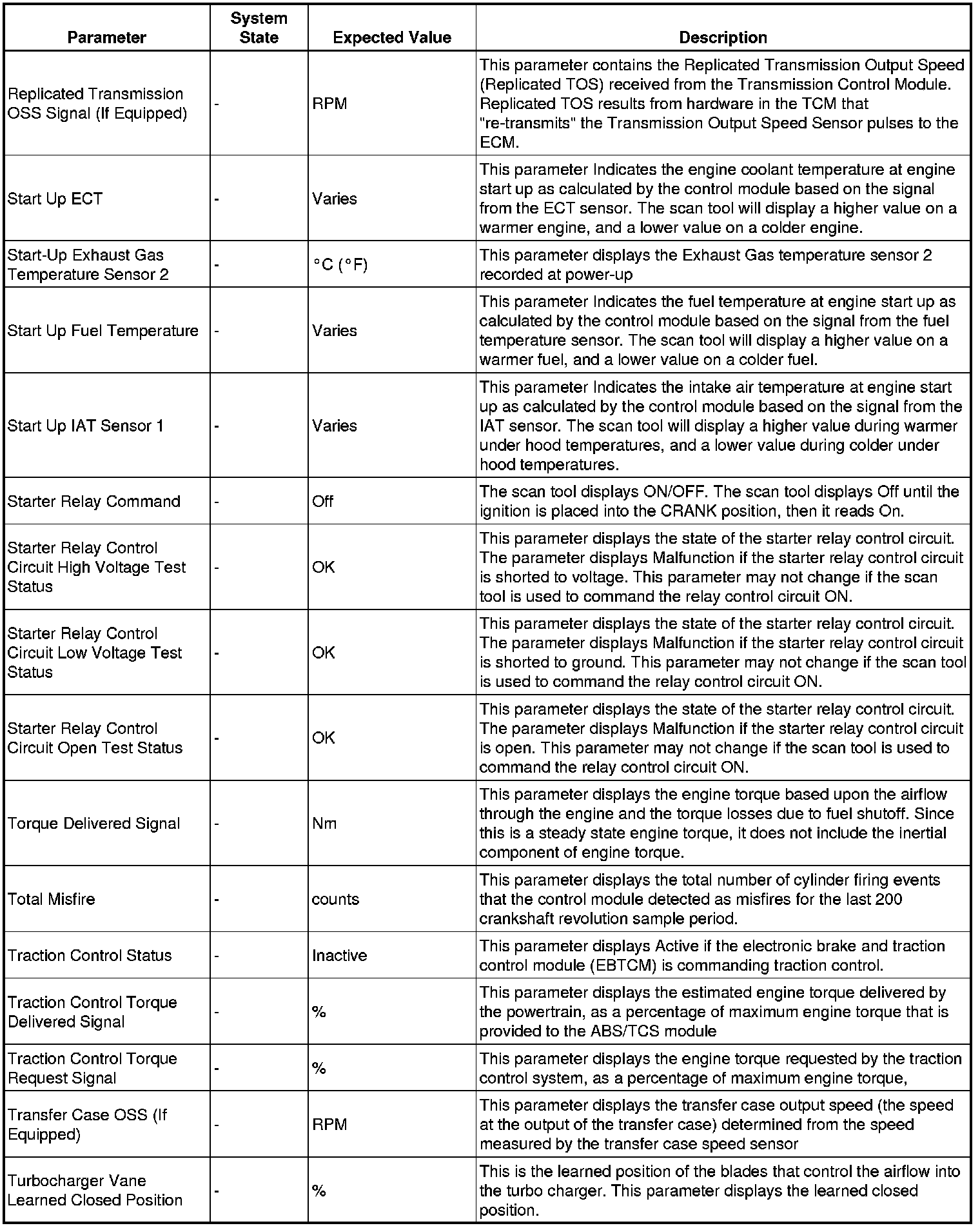 The Engine Control Module Scan Tool Data List contains all engine-related parameters that are available on the scan tool. The list is arranged in alphabetical order. A given parameter may appear in any one of the data lists, and in some cases may appear more than once, or in more than one data list in order to group certain related parameters together.