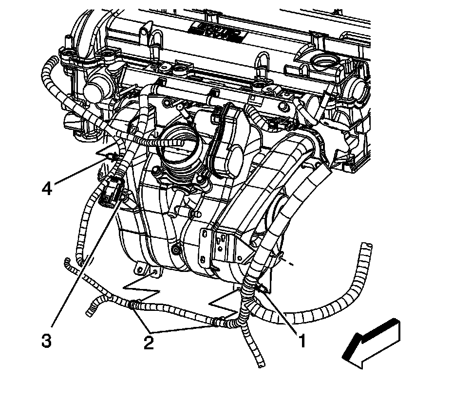 83. Install the engine harness clips (2, 4) to the intake manifold.