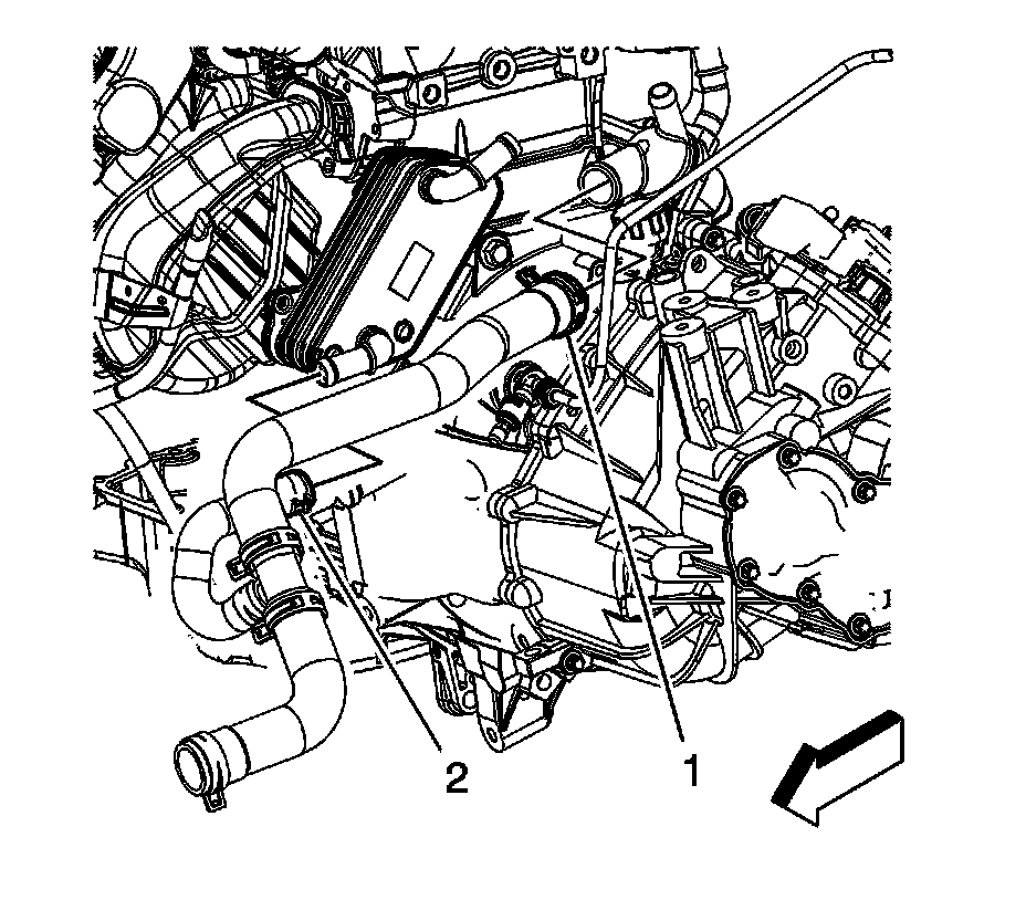 101. Position the radiator outlet hose clamp (2) at the oil cooler.