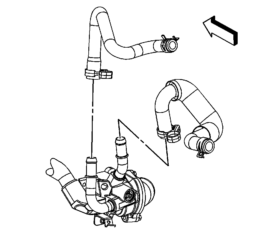 104. Position the heater inlet and outlet hose clamps at the thermostat housing.
