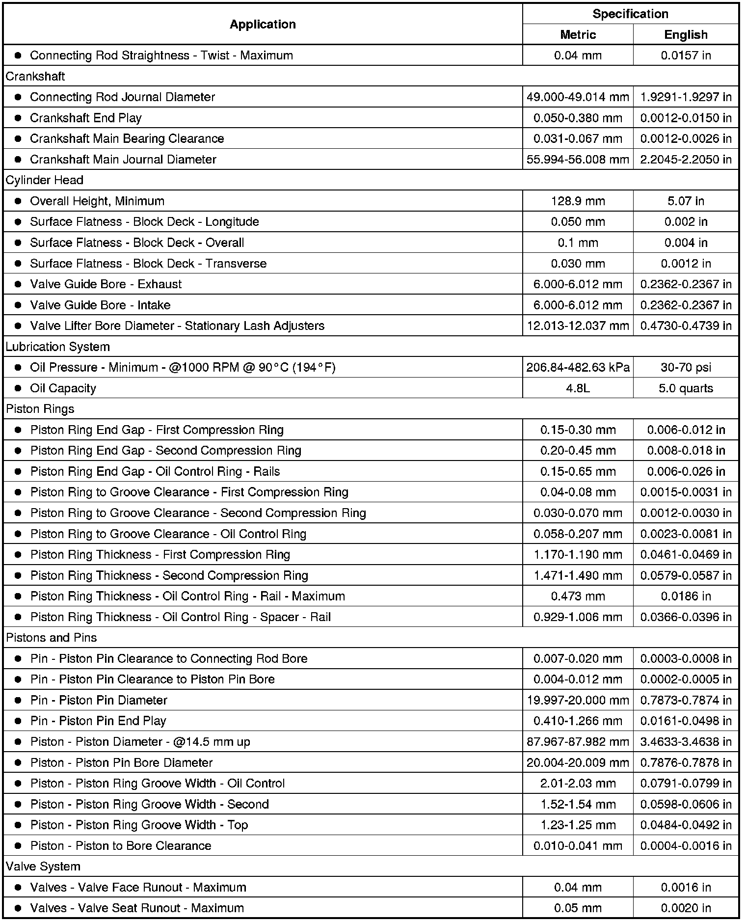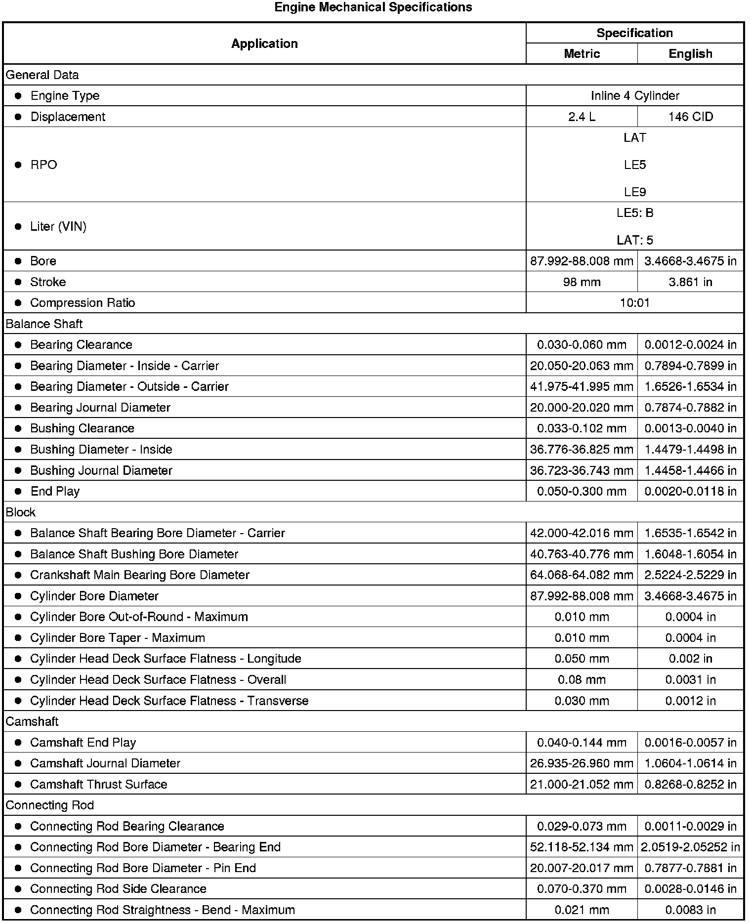 Engine Mechanical Specifications (LAT, LE5, LE9) (2.4L)