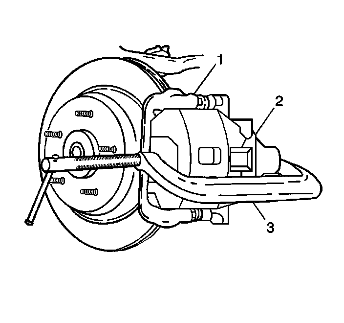 6. Compress the caliper piston enough for clearance. Use a C-clamp (3).