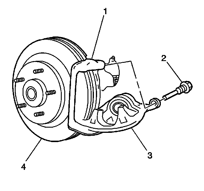 Caution: Support the brake caliper with heavy mechanic wire, or equivalent, whenever it is separated from its mount and the hydraulic flexible brake hose is still connected. Failure to support the caliper in this manner will cause the flexible brake hose to bear the weight of the caliper, which may cause damage to the brake hose and in turn may cause a brake fluid leak.