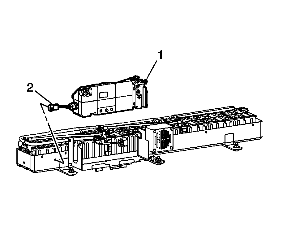4. Install the battery energy control module pigtail (2) clip to the side of the battery carrier.