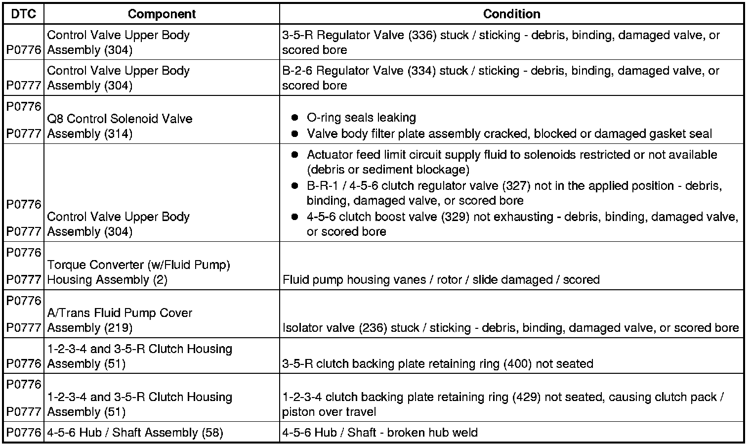 4. Listed in the chart below, are conditions for each component that could set DTC P0776 or P0777. Carefully inspect each component for that condition. Repair or replace as necessary.