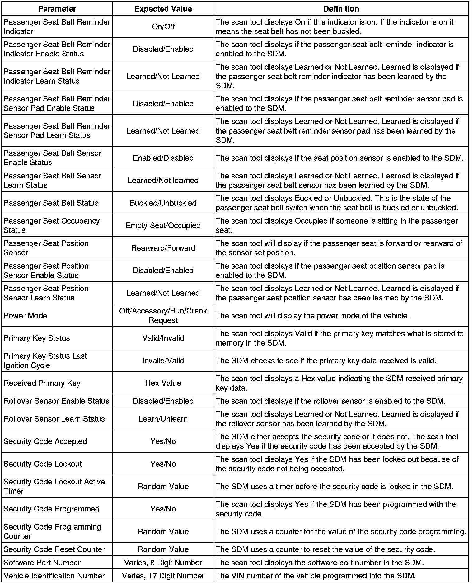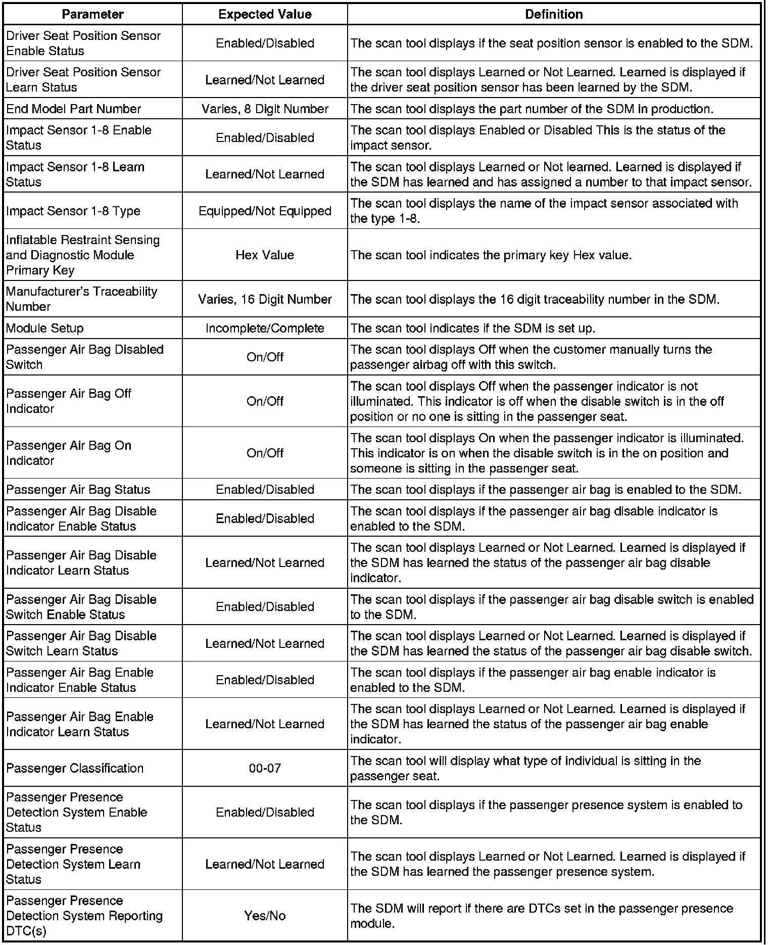 Inflatable Restraint Sensing and Diagnostic Module Scan Tool Information
