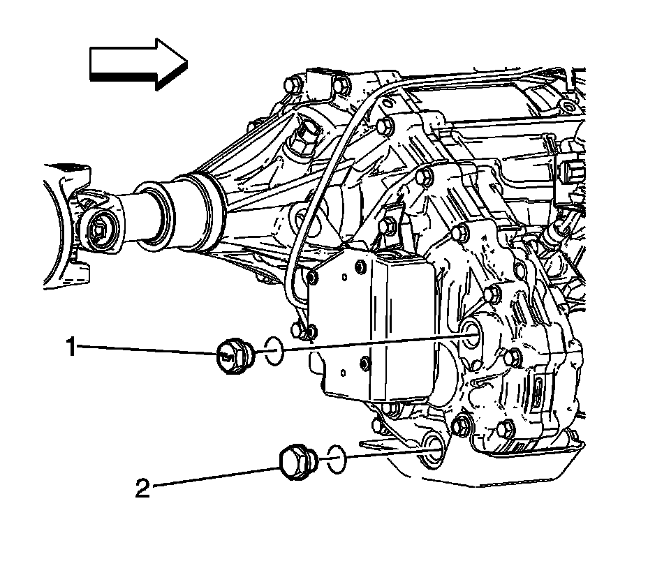 5. Remove the transfer case fluid drain plug (2) and O-ring gasket.