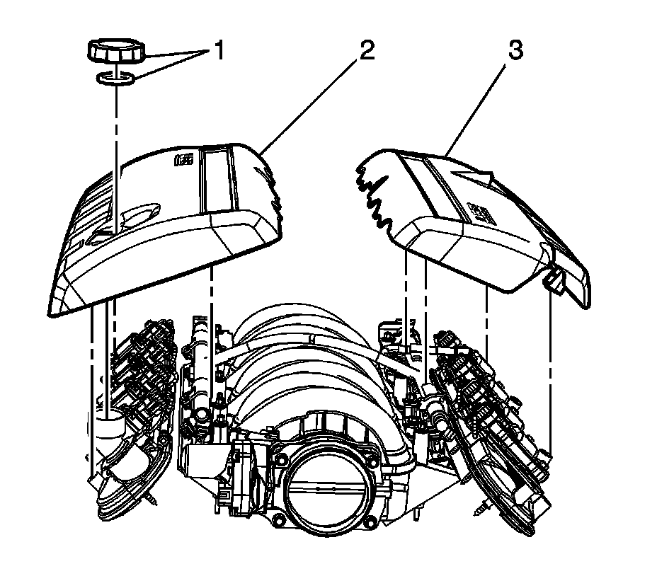 1. Remove the engine sight covers (2, 3). Refer to Upper Intake Manifold Sight Shield Replacement (LS9) (Upper Intake Manifold Sight Shield Replacement)Upper Intake Manifold Sight Shield Replacement (w/o LS9) (Upper Intake Manifold Sight Shield Replacement).
