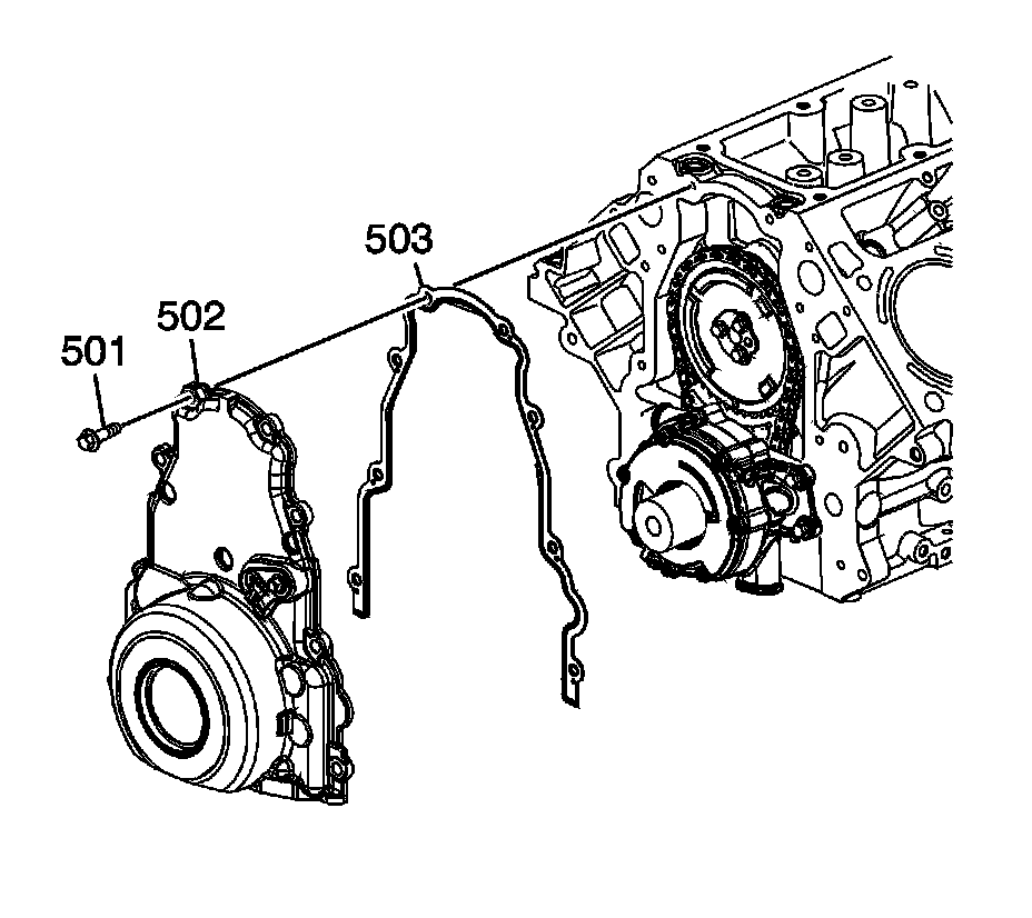 1. Install the front cover gasket (503), front cover (502), and bolts (501).