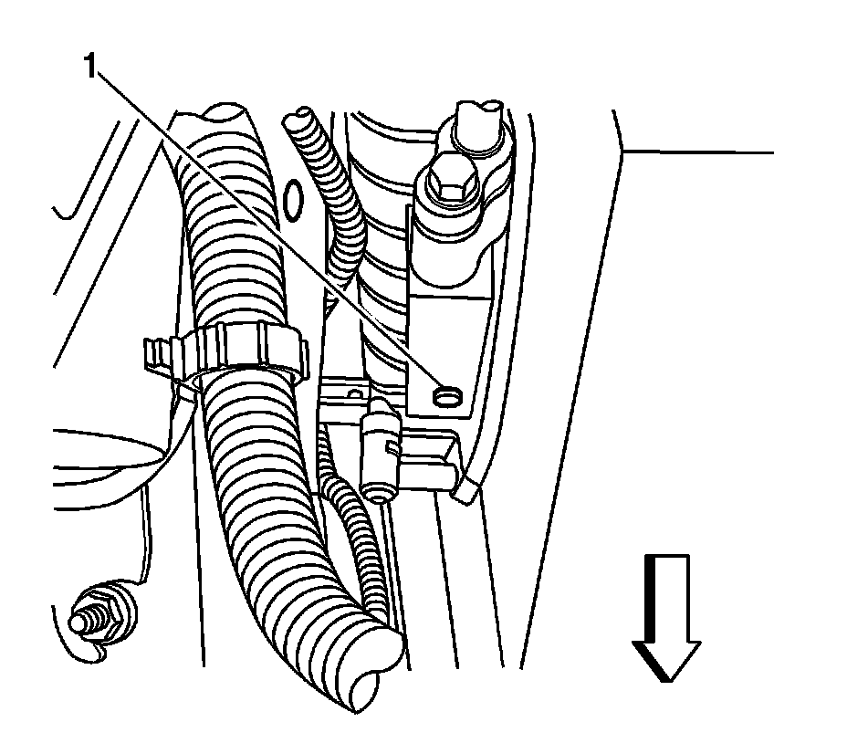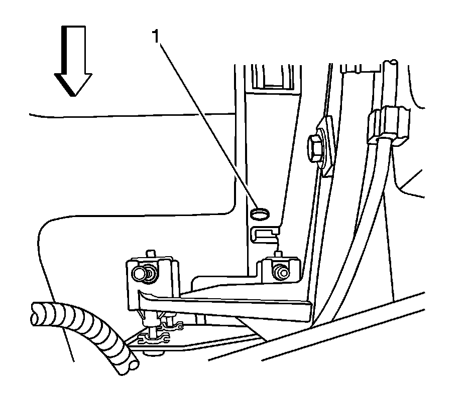 4. Remove the RH radiator air baffle upper retainer pin (1).