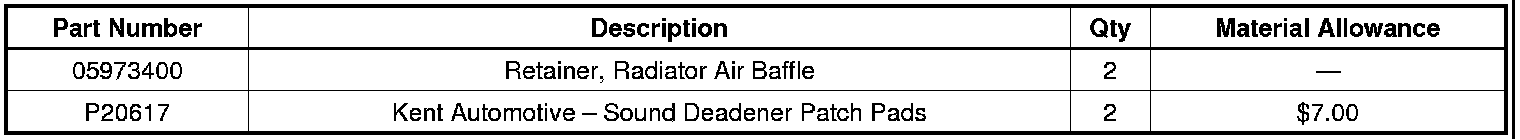 This is a picture of the upper radiator air baffle with a large gap that needs to be repaired. Repair the gap in the panel by making sure the retaining clips are properly seated or by installing new retaining clips, P/N 05973400. To access these clips, the vehicle needs to be raised and the three bolts securing the lower radiator air baffle to the bumper beam need to be removed.