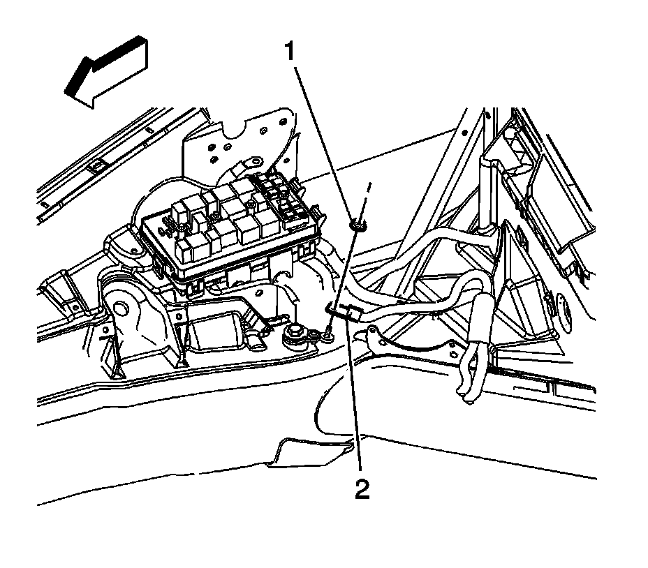 2. Remove the battery positive cable nut (1) and remove the battery positive cable lead (2).