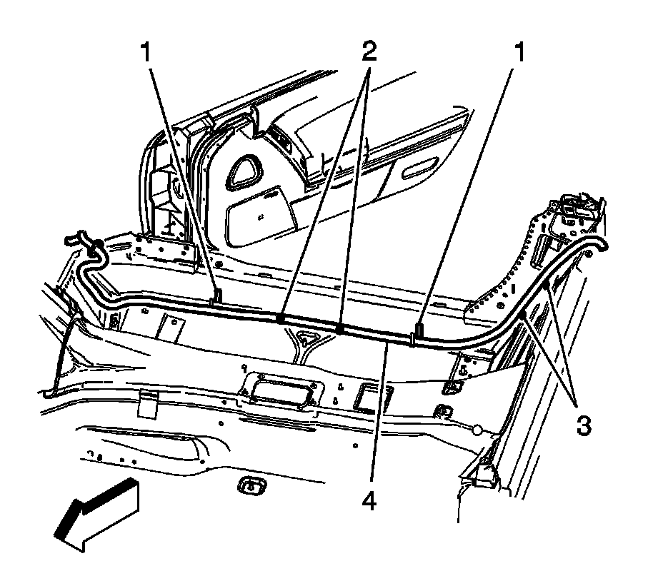 8. Secure the battery positive cable (3) along the right rear compartment with straps (2).