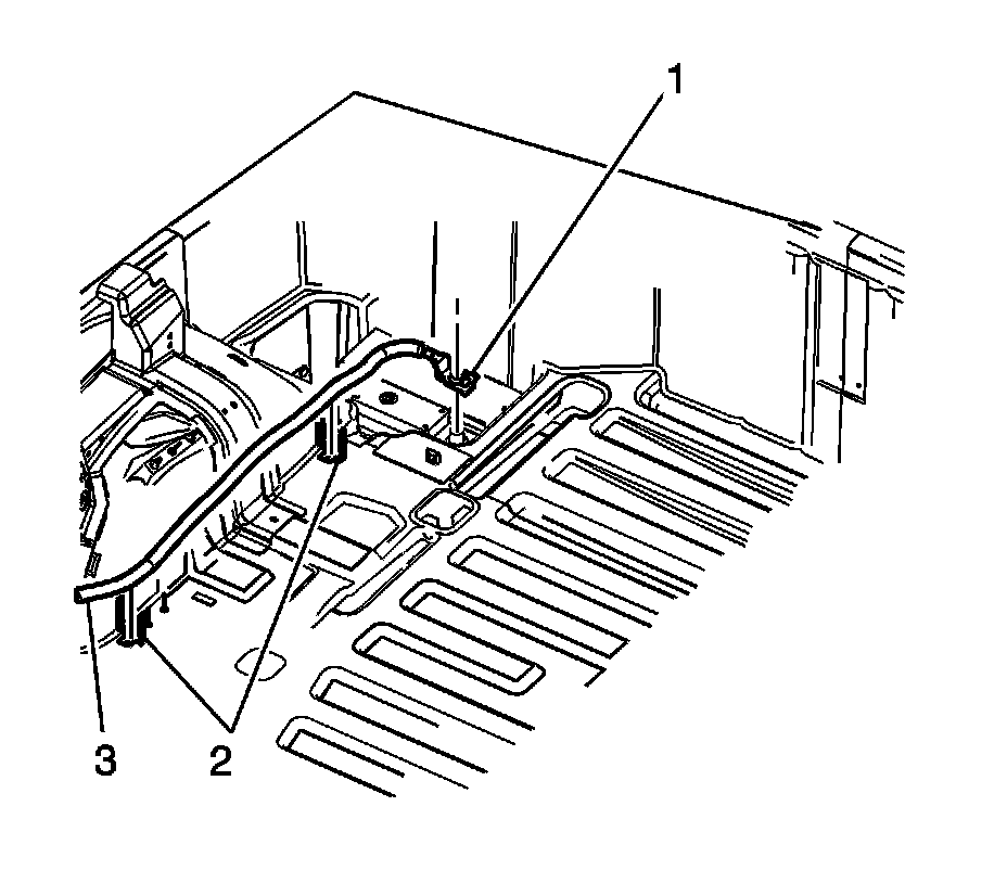 7. Route the battery positive cable through the plenum and fasten along the rocker panel with the straps (1) and fasteners (2),(3).