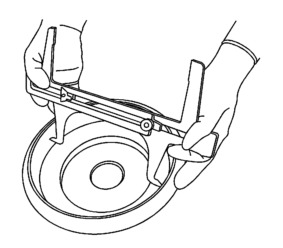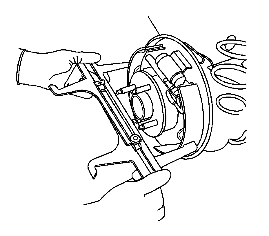 11. Rotate the brake shoe adjuster screw until the brake shoe linings contact the J-21177-A - Drum to Brake Shoe Clearance Gauge , and the feeler gauge.