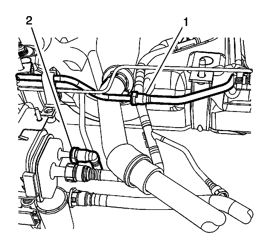 8. Disconnect the fuel feed line (1) and EVAP line (2) quick connect fitting. Refer to Plastic Collar Quick Connect Fitting Service (Plastic Collar Quick Connect Fitting Service).
