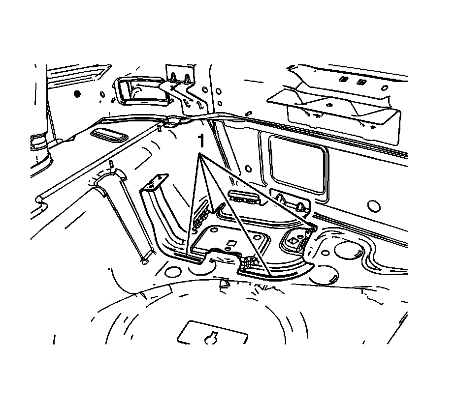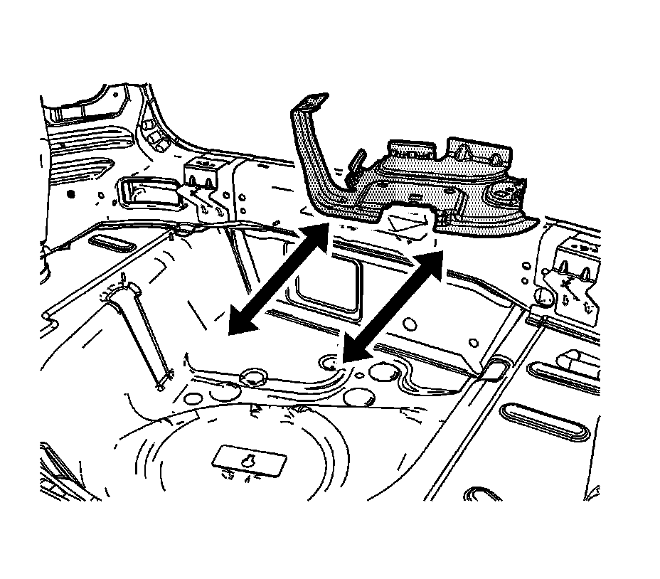7.Structural adhesive is present at the joint between the battery tray and the rear floor pan. Heat the battery tray at the locations shown with a small flame from an oxy-acetylene torch to release the bond to the rear floor panel.
