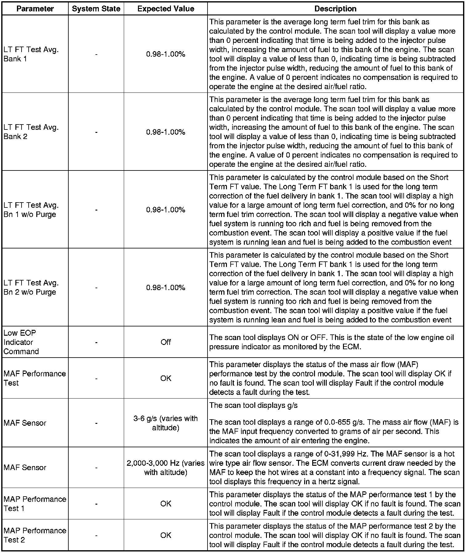 The scan tool values from a properly running engine may be used for comparison with the engine you are diagnosing. The Engine Scan Tool Data List represents values that would be seen on a normally running engine.