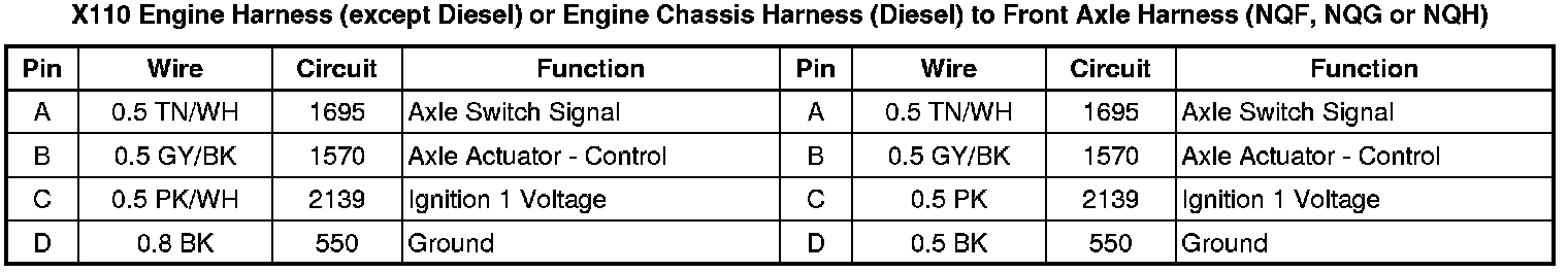 X110 Engine Harness (except Diesel) or Engine Chassis Harness (Diesel) to Front Axle Harness (NQF, NQG or NQH)