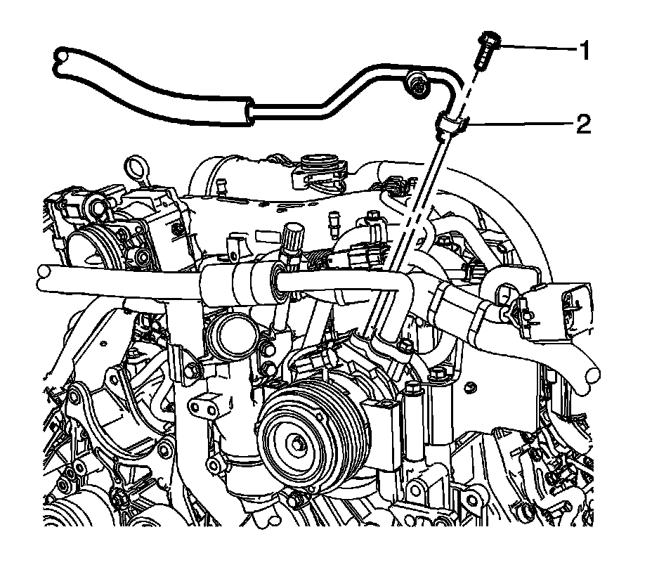 2. Remove the discharge hose mounting bolt (1) from the A/C compressor.