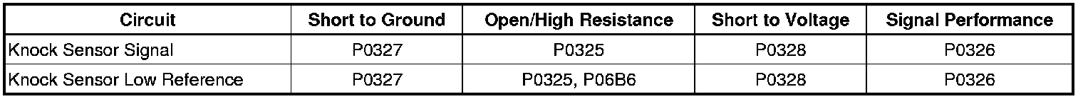 The ECM detects that a knock sensor signal circuit is shorted to ground.