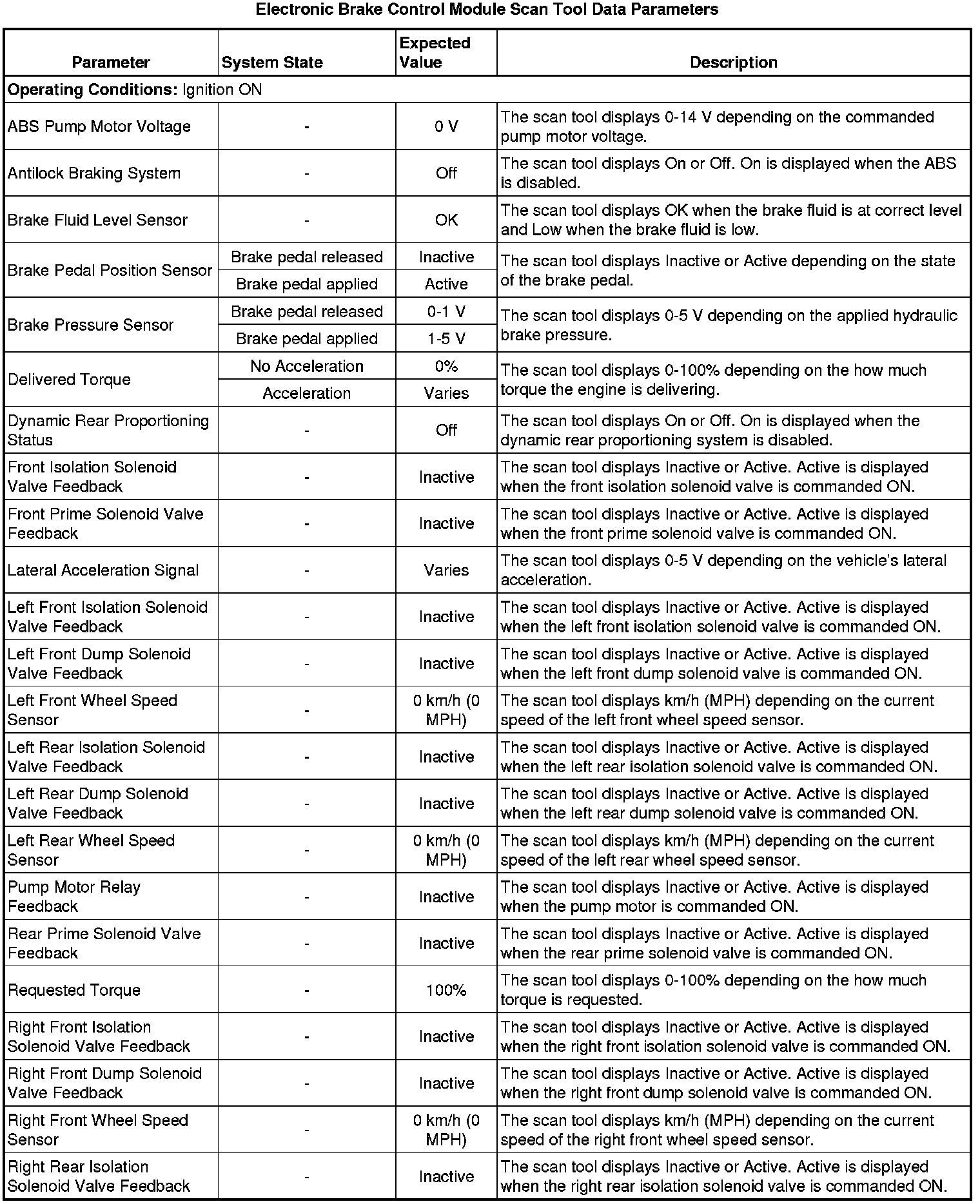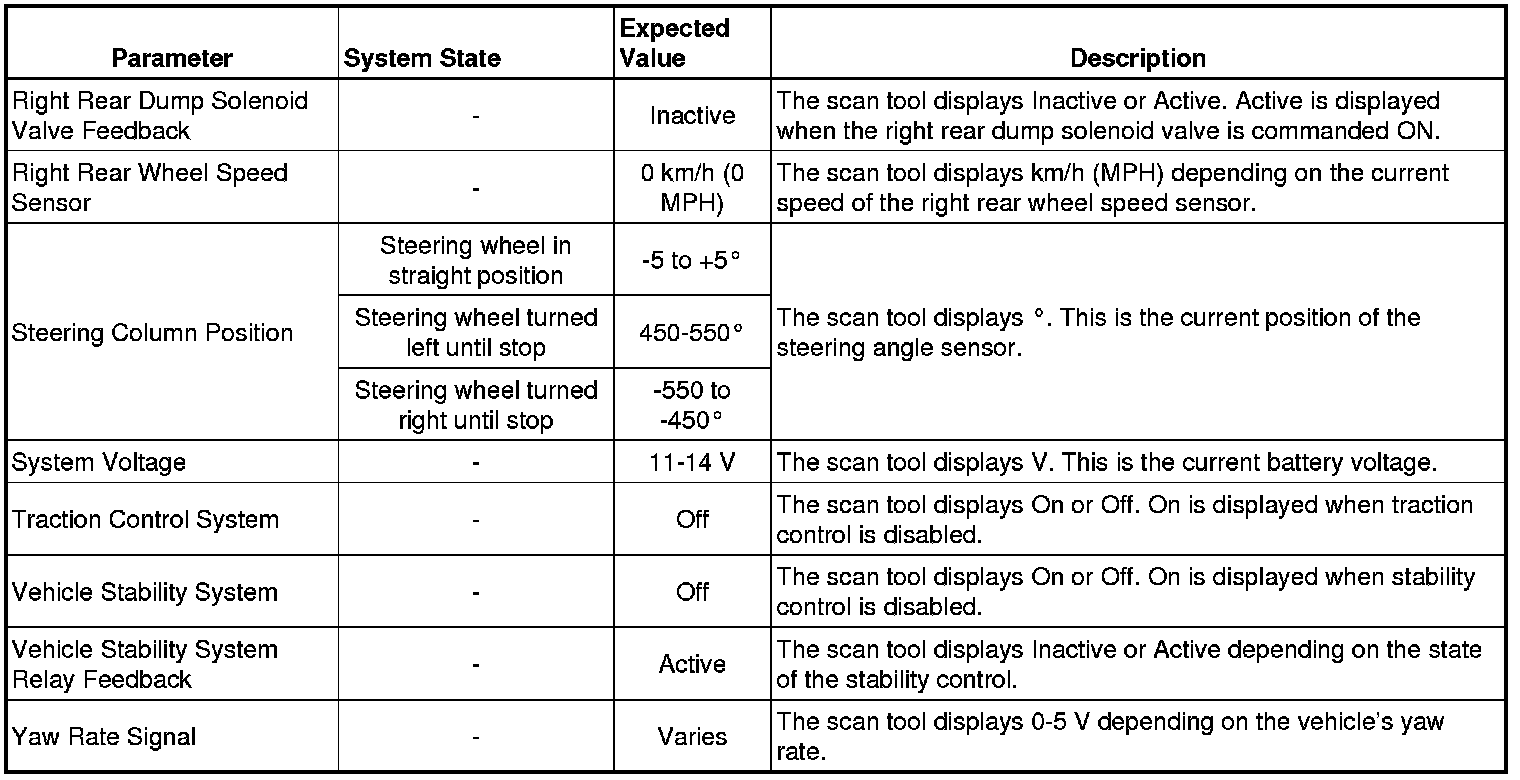 The Electronic Brake Control Module scan tool data parameters list contains all ABS related parameters that are available on the scan tool. The list is arranged in alphabetical order. A given parameter may appear in any one of the data lists.