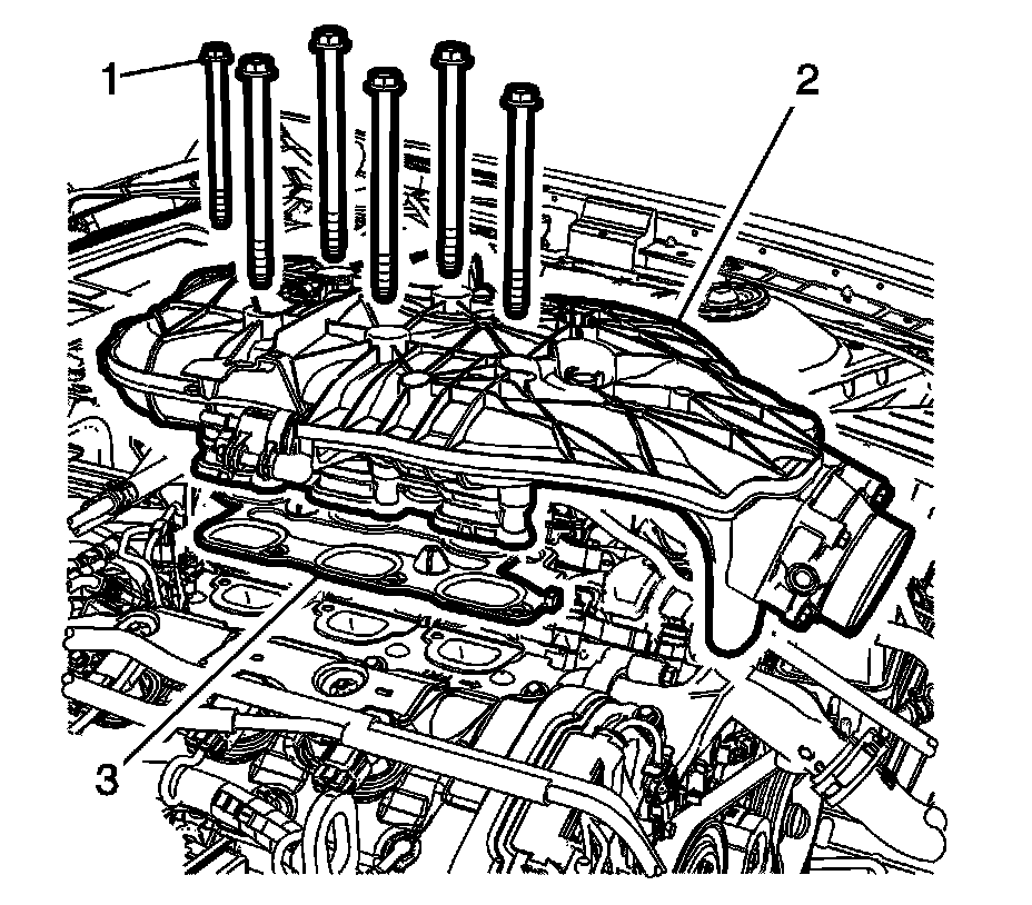 3. Position the intake manifold (2) and hand start the manifold bolts (1).