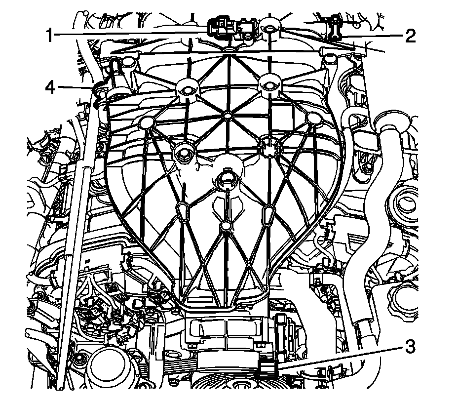 1. Remove the intake manifold cover (2). Refer to Intake Manifold Cover Replacement - Front Intake Manifold Cover Replacement - Front.