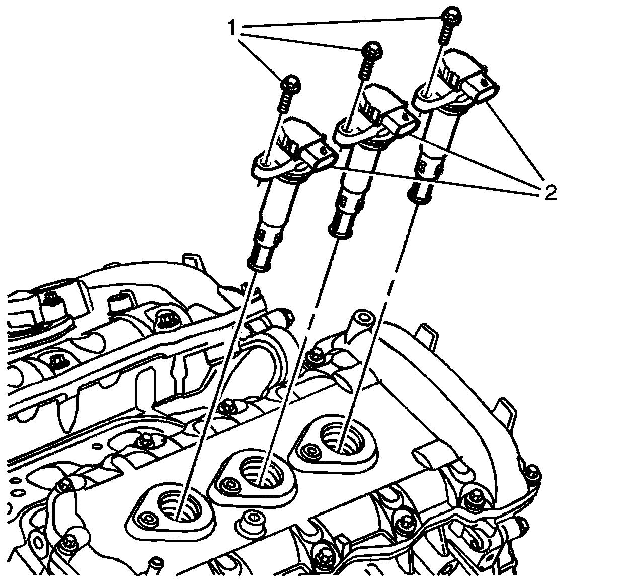 2. Install the ignition coil to camshaft cover retaining bolts♦(1) and tighten to 10♦Nm (89♦lb♦in)..