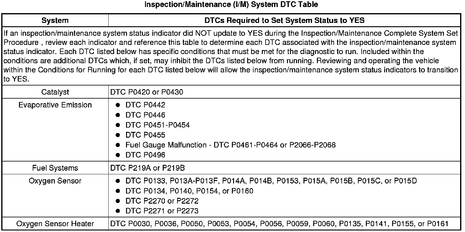 Inspection/Maintenance (I/M) System DTC Table