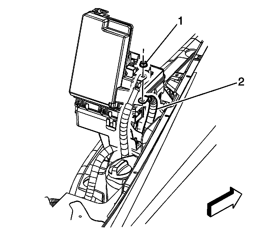 10. Remove the positive battery cable lead (2) from the fuse/relay center stud.