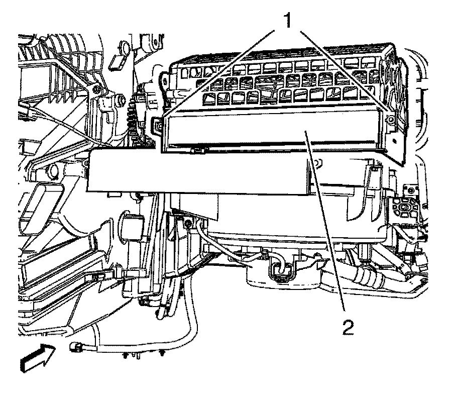 1. Install passenger compartment air filter (2) and clip in 2 clips (1).