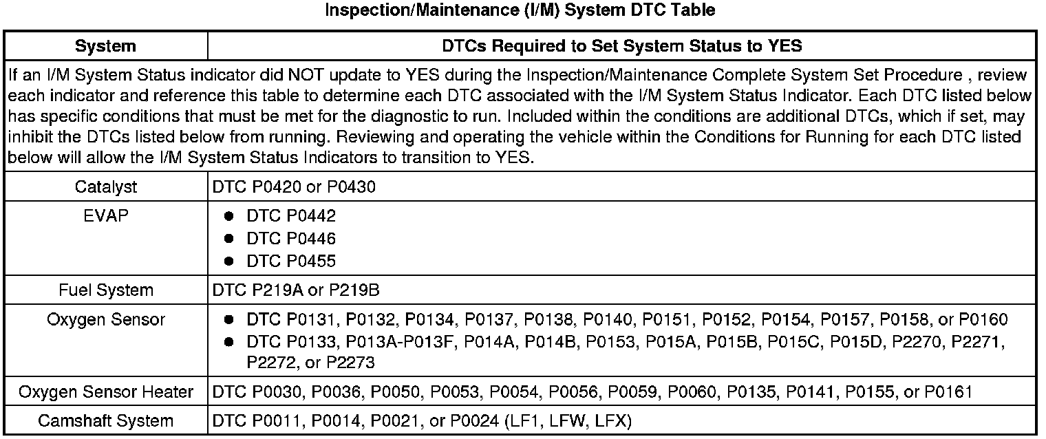 Inspection/Maintenance (I/M) System DTC Table