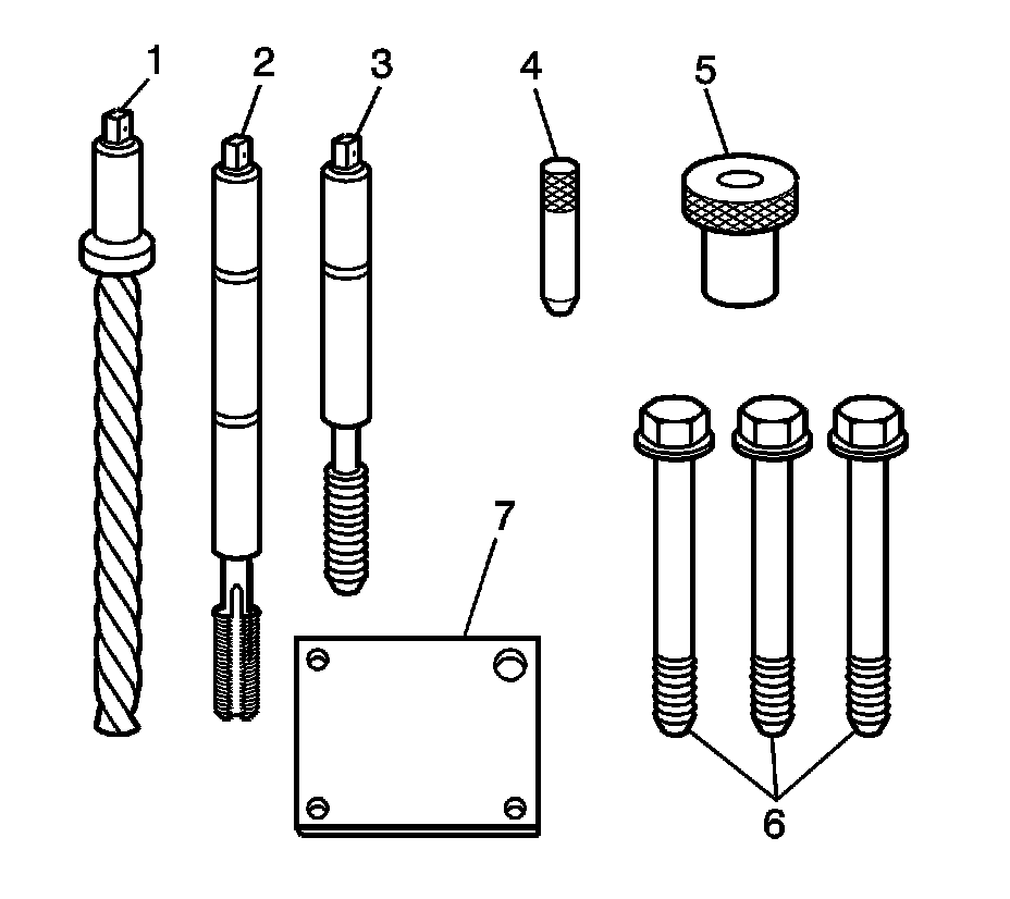 1. Position the fixture plate (3) with the bushing (1) installed over the cylinder head bolt hole to be repaired (4).