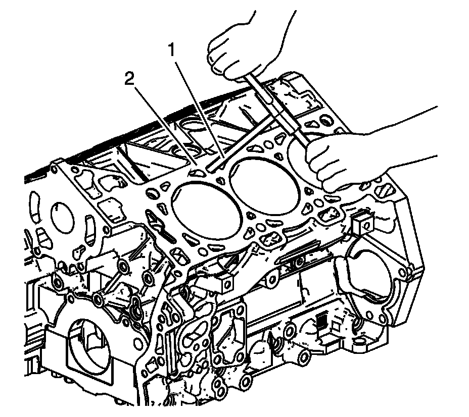 22. In order to completely form the new threads in the insert, rotate the driver installation tool through the insert until the mark (1) on the driver installation tool aligns with the surface of the engine block deck (2).
