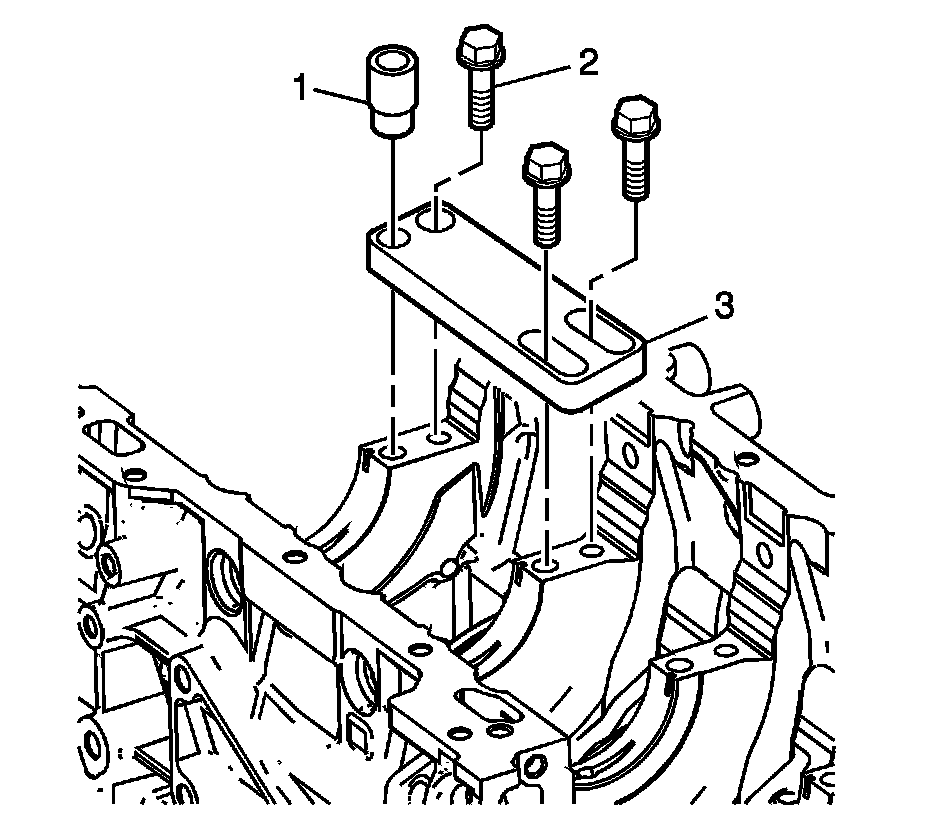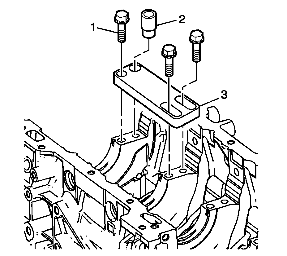 1. Position the fixture plate (3) with the bushing (1) installed over the crankshaft main cap bolt hole to be repaired.