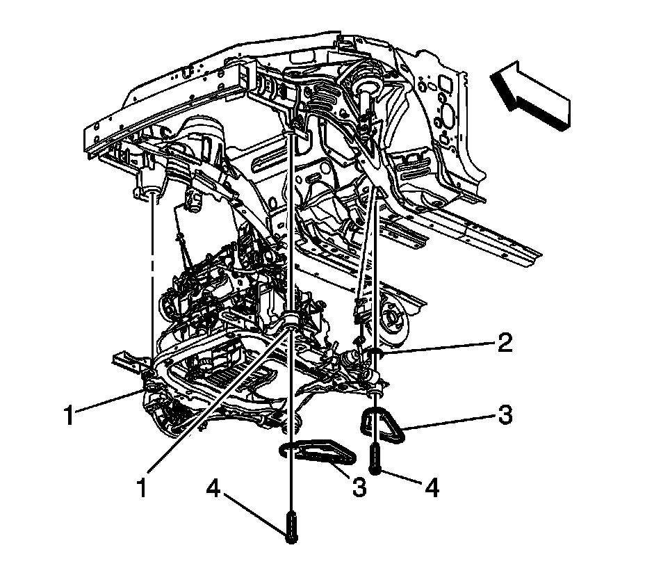 6. Install the rear frame bolts (4) and tighten to 100 Nm (74 lb ft) plus 90 degrees rotation.