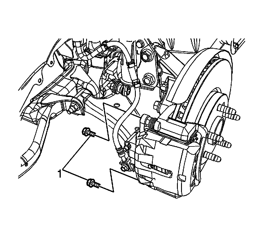 8. Using a backup wrench to hold the brake caliper guide pin stationary, install the brake caliper guide pin bolts (1) and tighten to 27 Nm (20 lb ft).