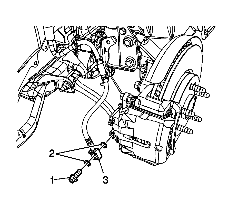 3. Assemble the brake hose fitting bolt (1) and the 2 new brake hose fitting gaskets (2) to the brake hose fitting (3).
