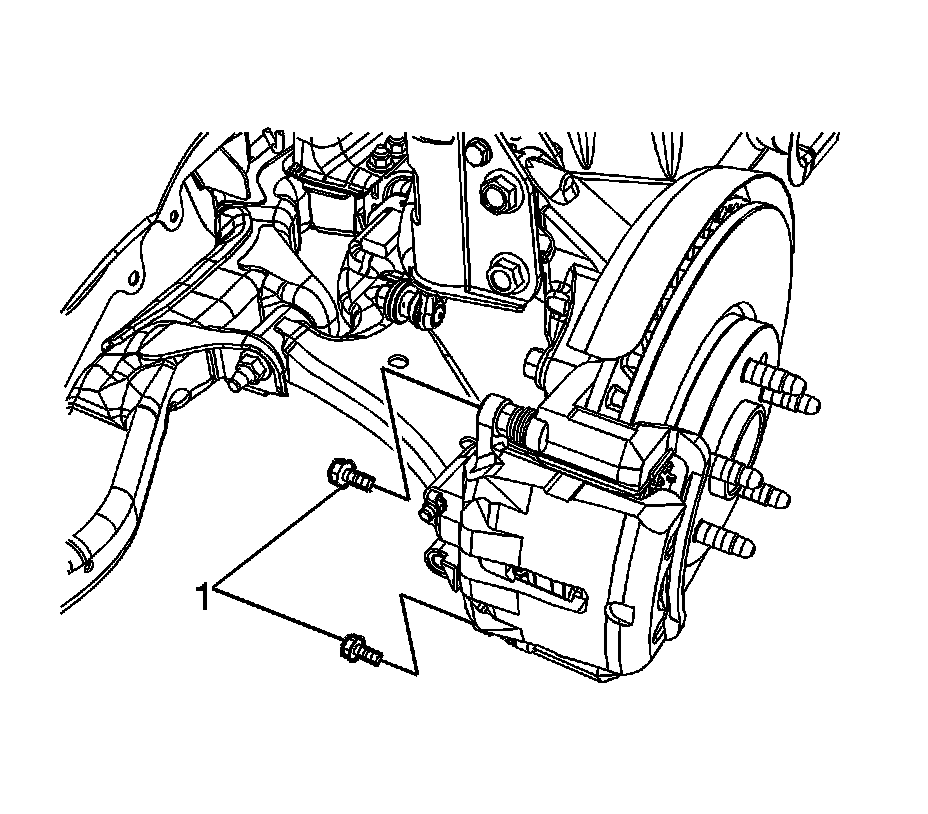 2. Using a backup wrench to hold the brake caliper guide pin stationary, install the brake caliper guide pin bolts (1) and tighten to 27 Nm (20 lb ft).