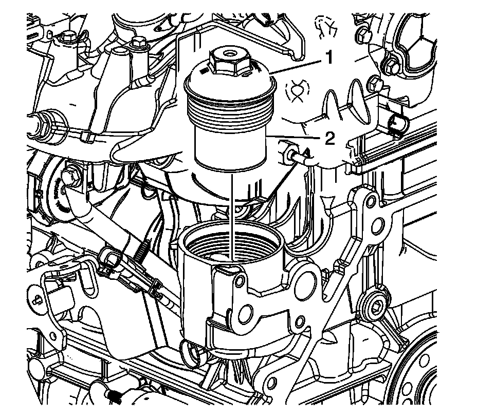 5. Use EN-44887 - wrenchto Install a NEW oil filter (2) and a NEW seal and tighten the oil filter cap (1) to 22 Nm (16 lb ft).