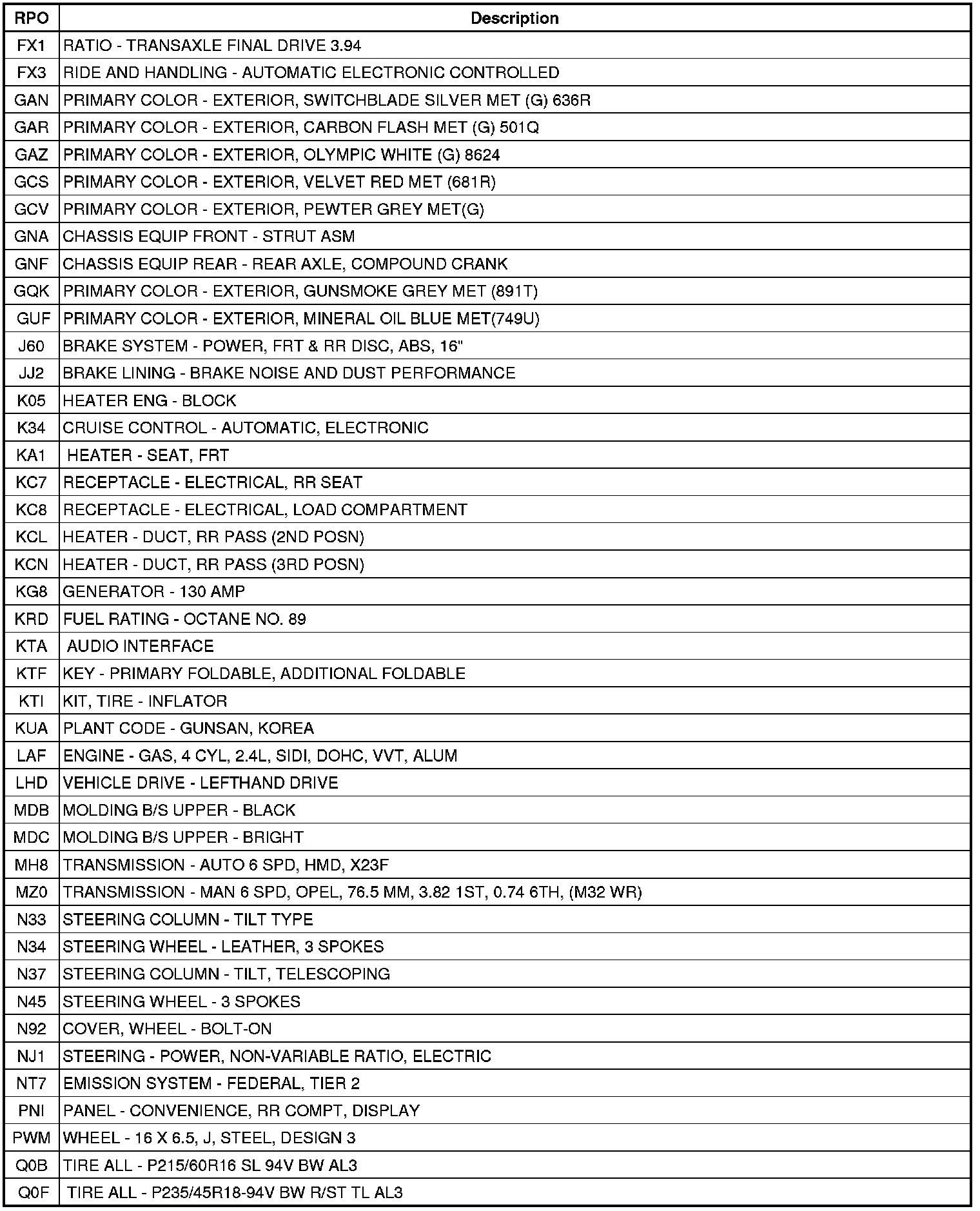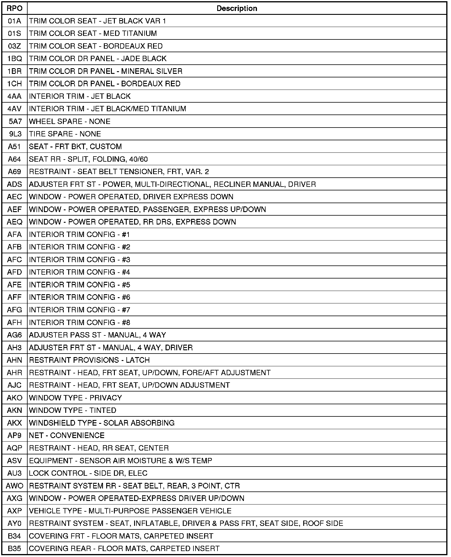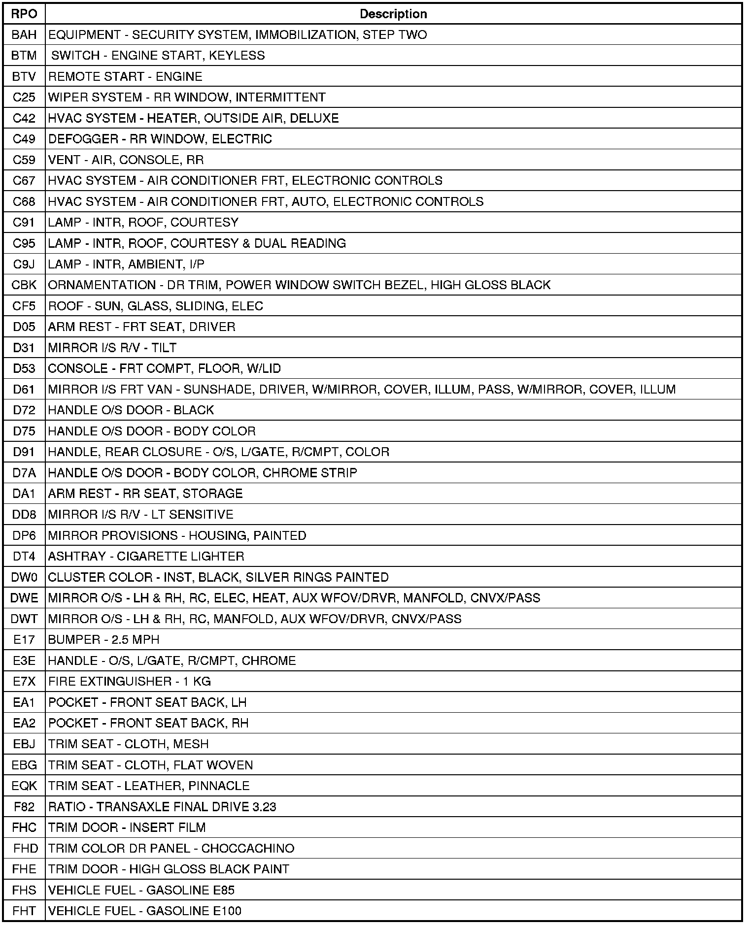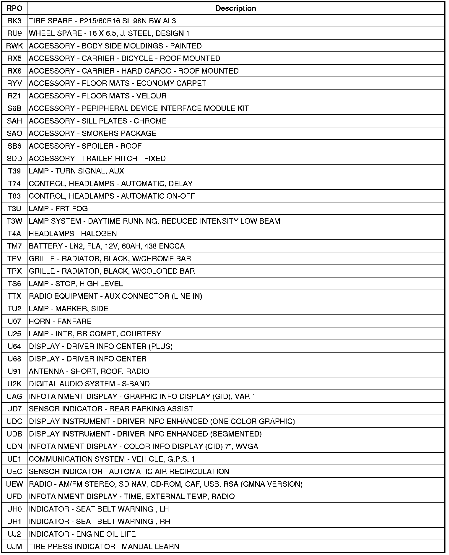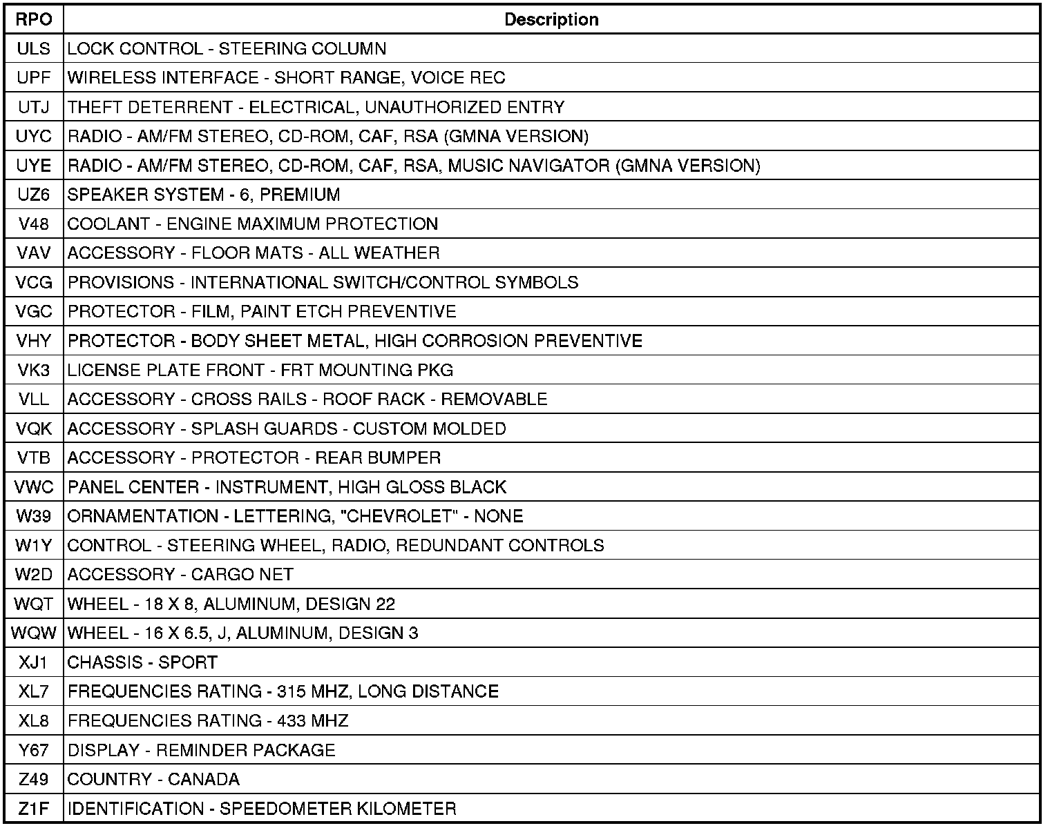 The following table provides the description of the Regular Production Option (RPO) codes that are available on the vehicle. The vehicle's RPO list is printed on the Service Parts Identification Label.