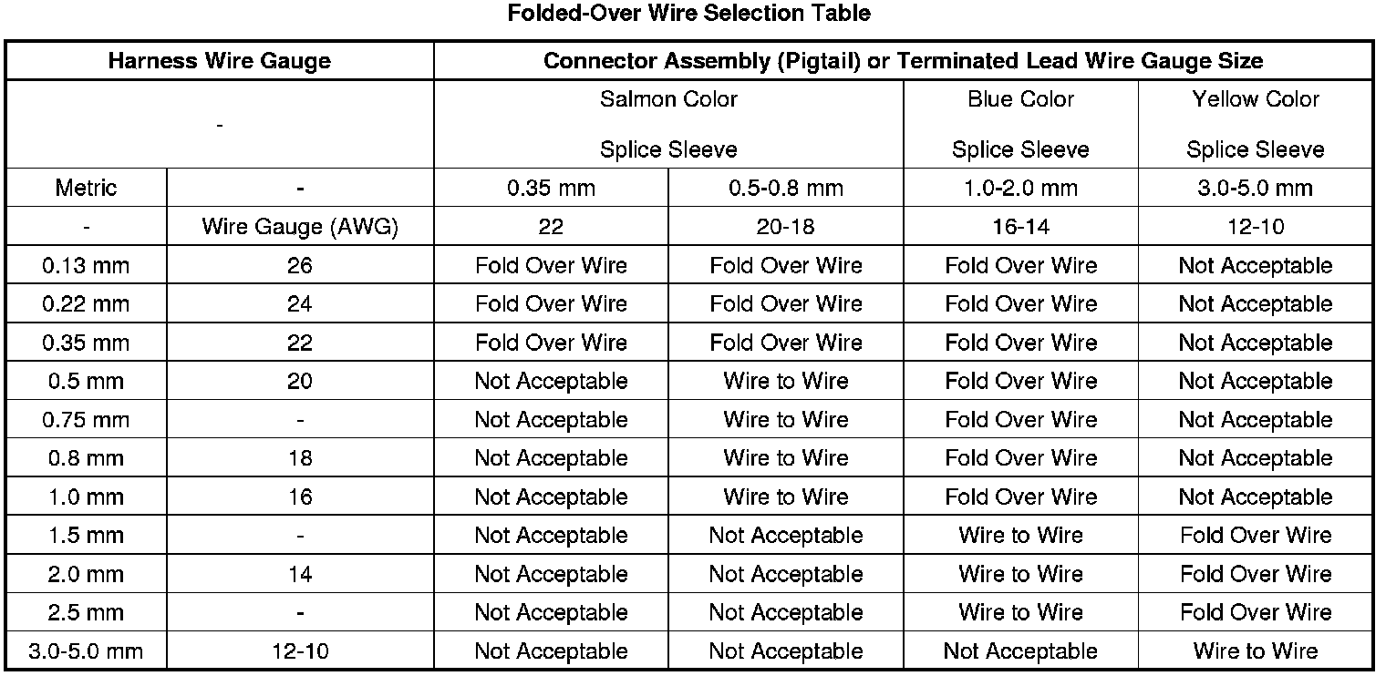 The folded over wire repair technique, in which the copper wire strands are folded over before being installed into a splice sleeve, allows the service part to be used when repairing a smaller gauge size wire in a vehicle. This technique has passed all GM testing standards.