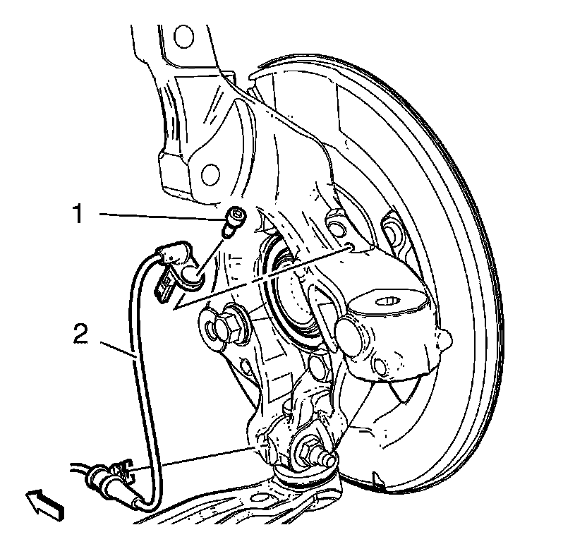 6. Install the wheel speed sensor bolt (1) and tighten to 6 Nm (53 lb in).