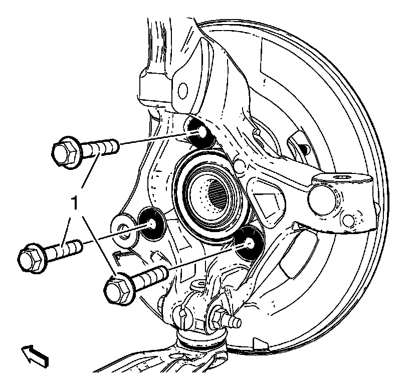 7. Remove and DISCARD the wheel bearing/hub mounting bolts (1).