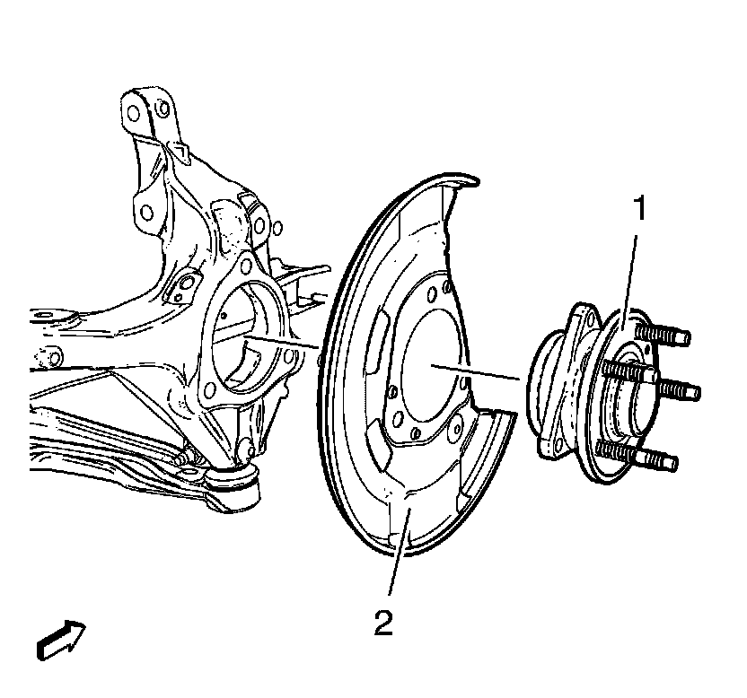 8. Remove the wheel bearing/hub (1) and front brake shield (2) from the steering knuckle.