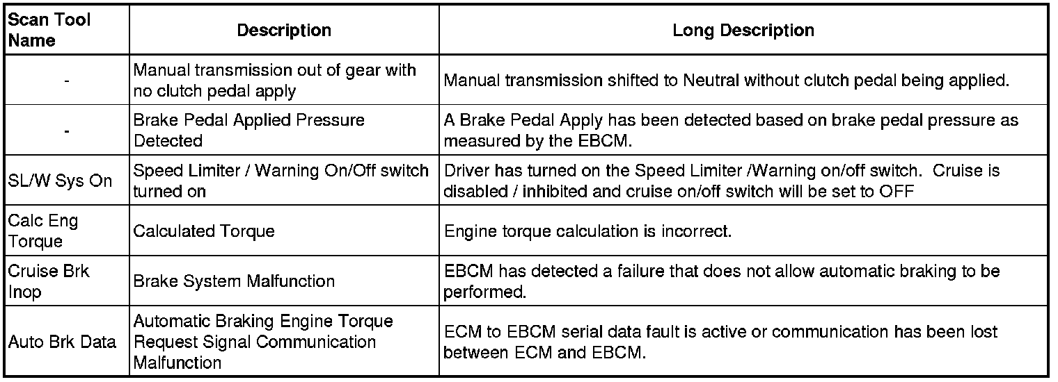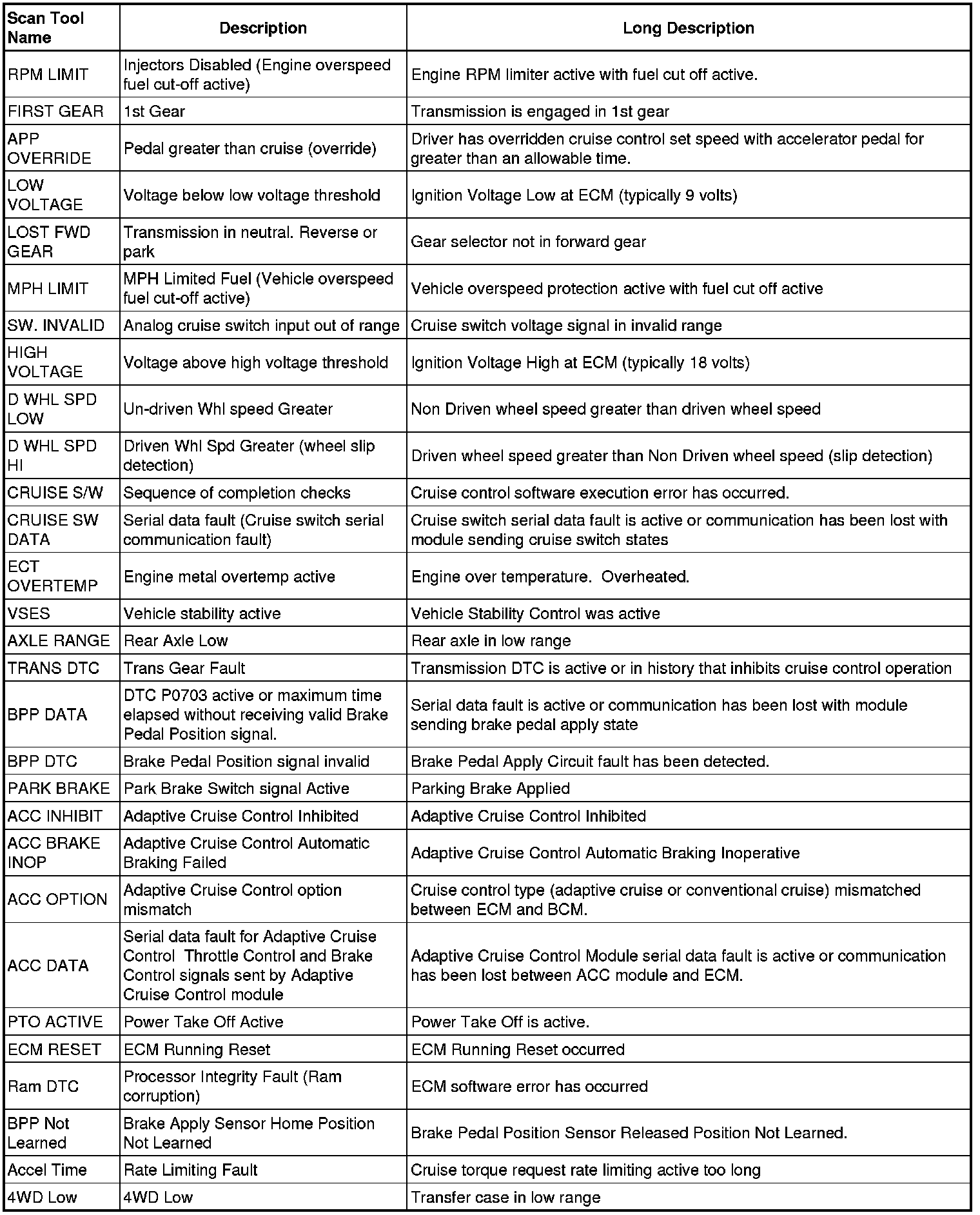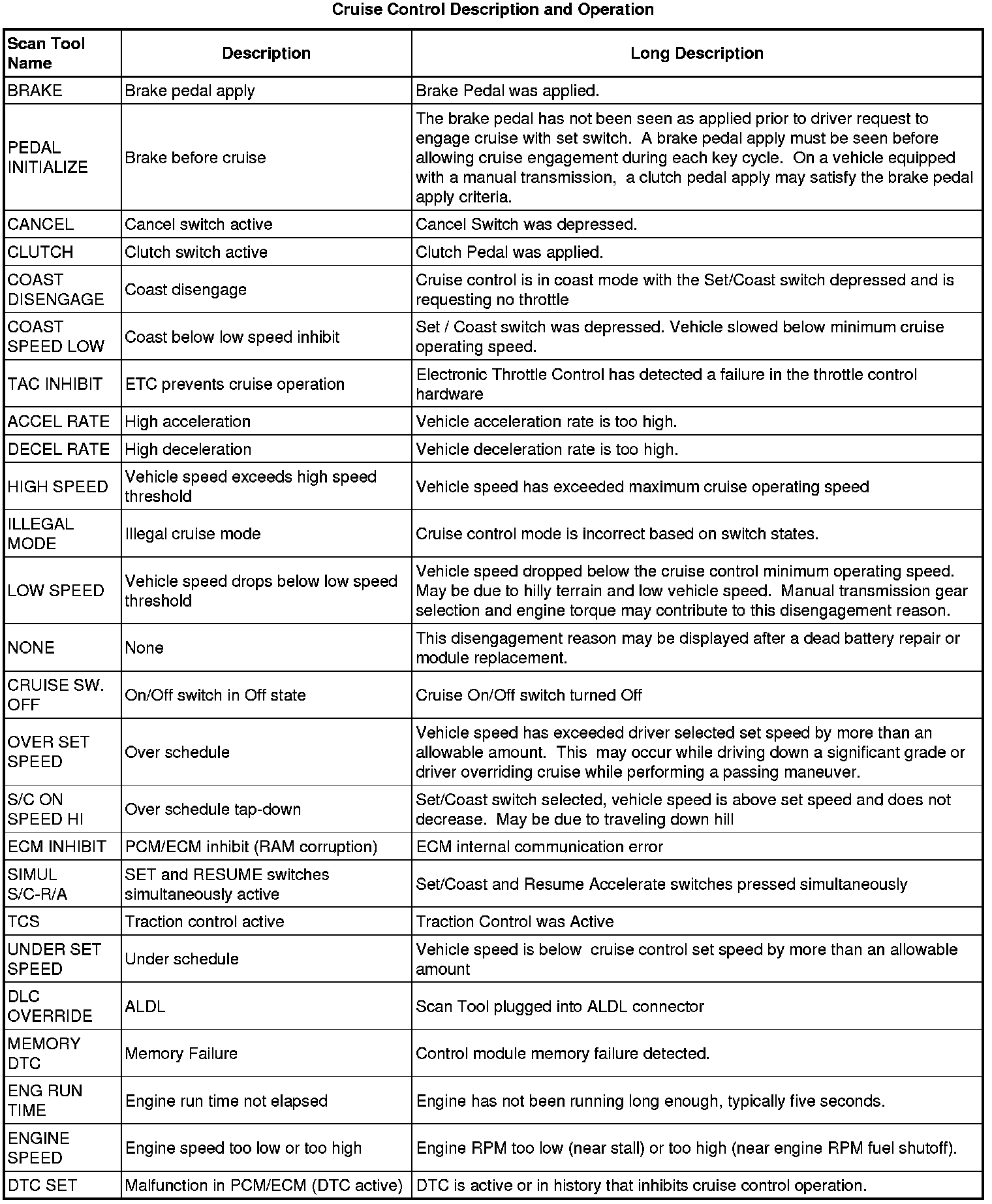 Every time the cruise control system is disengaged, the ECM will keep track of the reason for system disengagement. The last 8 disengagement reasons will be recorded within the ECM memory. The scan tool will display the last 8 Cruise Disengage History parameters, in which one out of approximately 50 possible reasons will be displayed in each of these 8 parameters. For the disengagement reason to be displayed within the scan tool parameter either the cruise control system is active and disengagement is requested, or engagement of the system is requested but a fault is present.