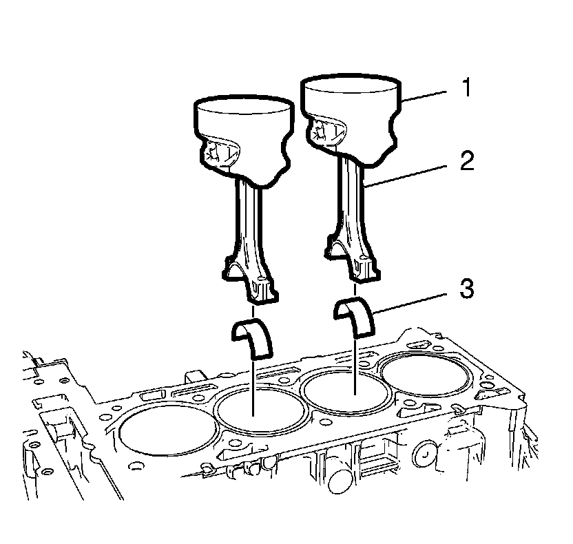 8. Remove the piston (1) with the connecting rod (2) and remove and DISCARD the upper bearing (3).