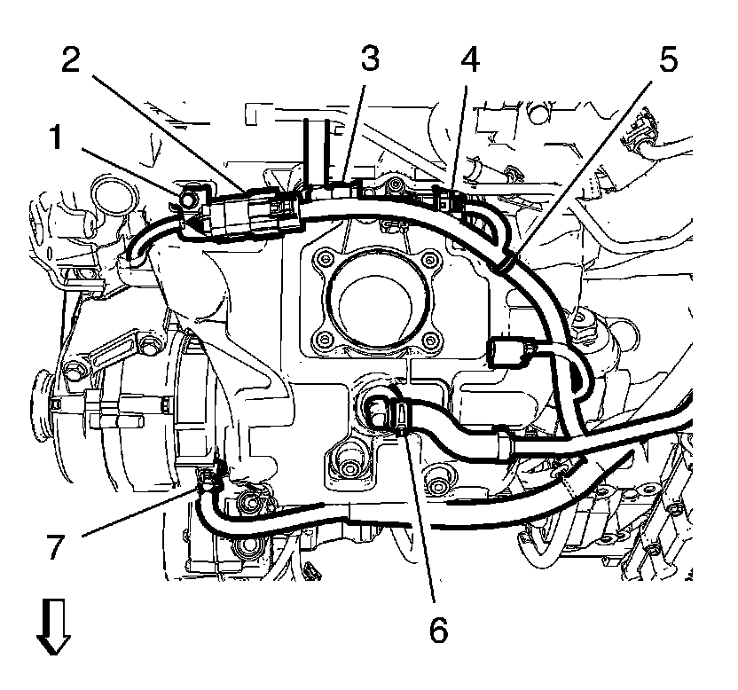 7. Position the ECM wiring harness and clip in the ECM wiring harness clip (5) to the intake manifold.