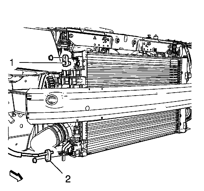 7. Install the 4 radiator air side upper baffle bolts (2) and tighten to 4 Nm (35 lb ft).